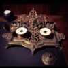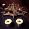 il dispose de 2 compartiments en faience. Le bronze ouvragé est orné d’une tête d’ange et d’une tête de lion.